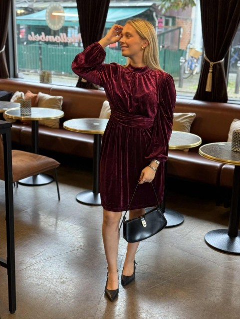 Denne nydelige kjolen i myk velour har et luksuriøst uttrykk med vakker glans og en flatterende passform. Overdelen høy hals som skaper en feminin silhuett, mens det brede midjepartiet og strikken i ryggen sørger for en behagelig og fleksibel passform som former seg etter kroppen.