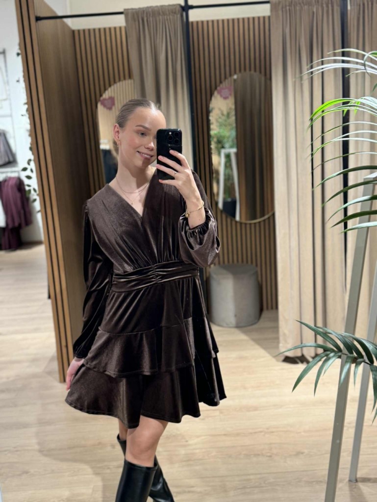 Myk Velour og femenine  detaljer gjør denne kjolen til ett blikkfang. Denne Brune velouren er skapt for sesongens festligheter .