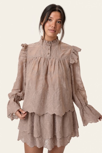 Bluse i lysebrunt, brodert stoff. Designet med høy halsutringning med rysjekant og en stolpe foran med trukne knapper. Rynking langs bærestykket gir volum til kroppen. Blusen har lange ermer med strikk i mansjettene og en litt utsvingt ermeåpning. Små rysjer på skuldrene og en kamskjellkant nederst følger stoffets mønster.