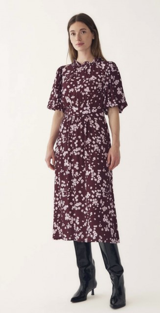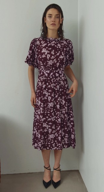 -Ruth Dress er en flytende kjole med puffermer og innsvinget midje som fremhever figuren. Kjolen har en volangkrage og et blomstret all-over-print.
